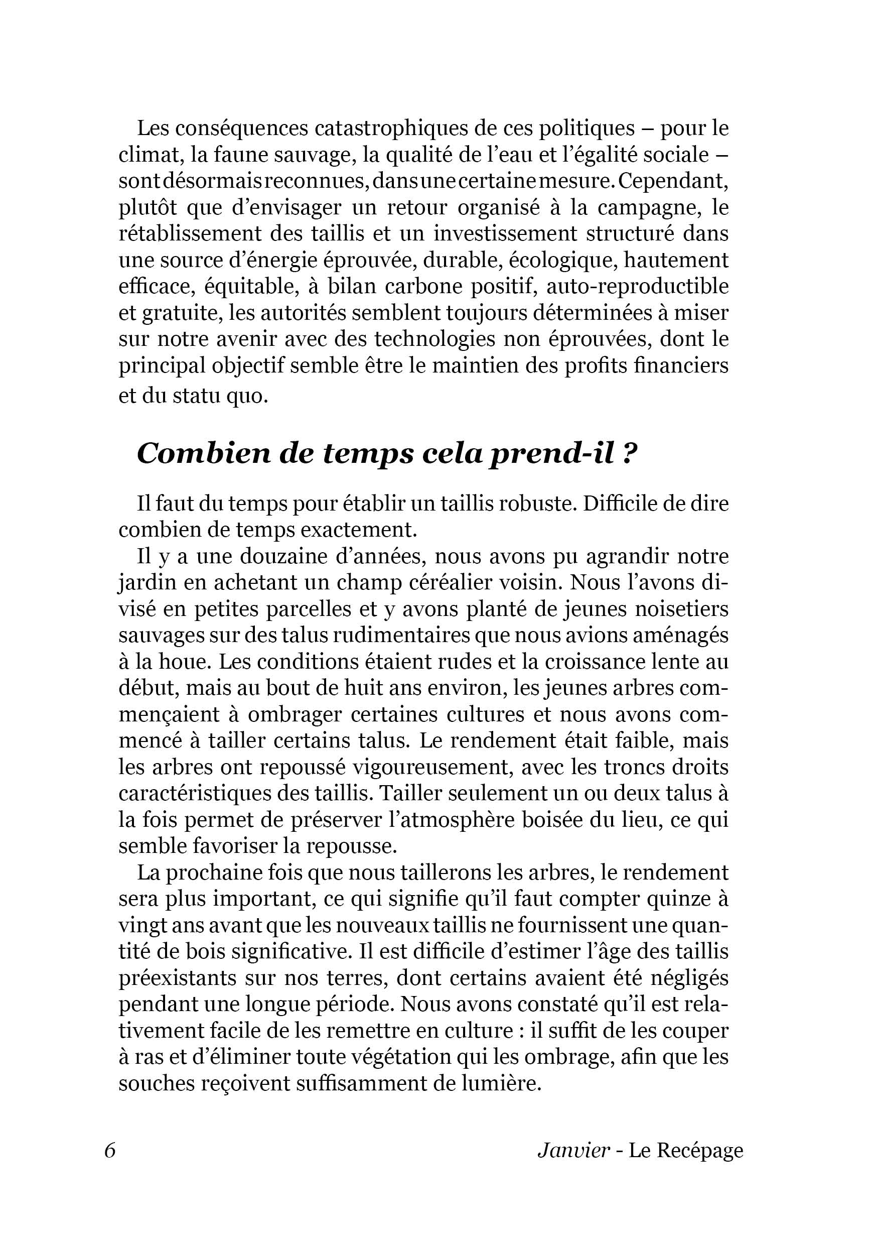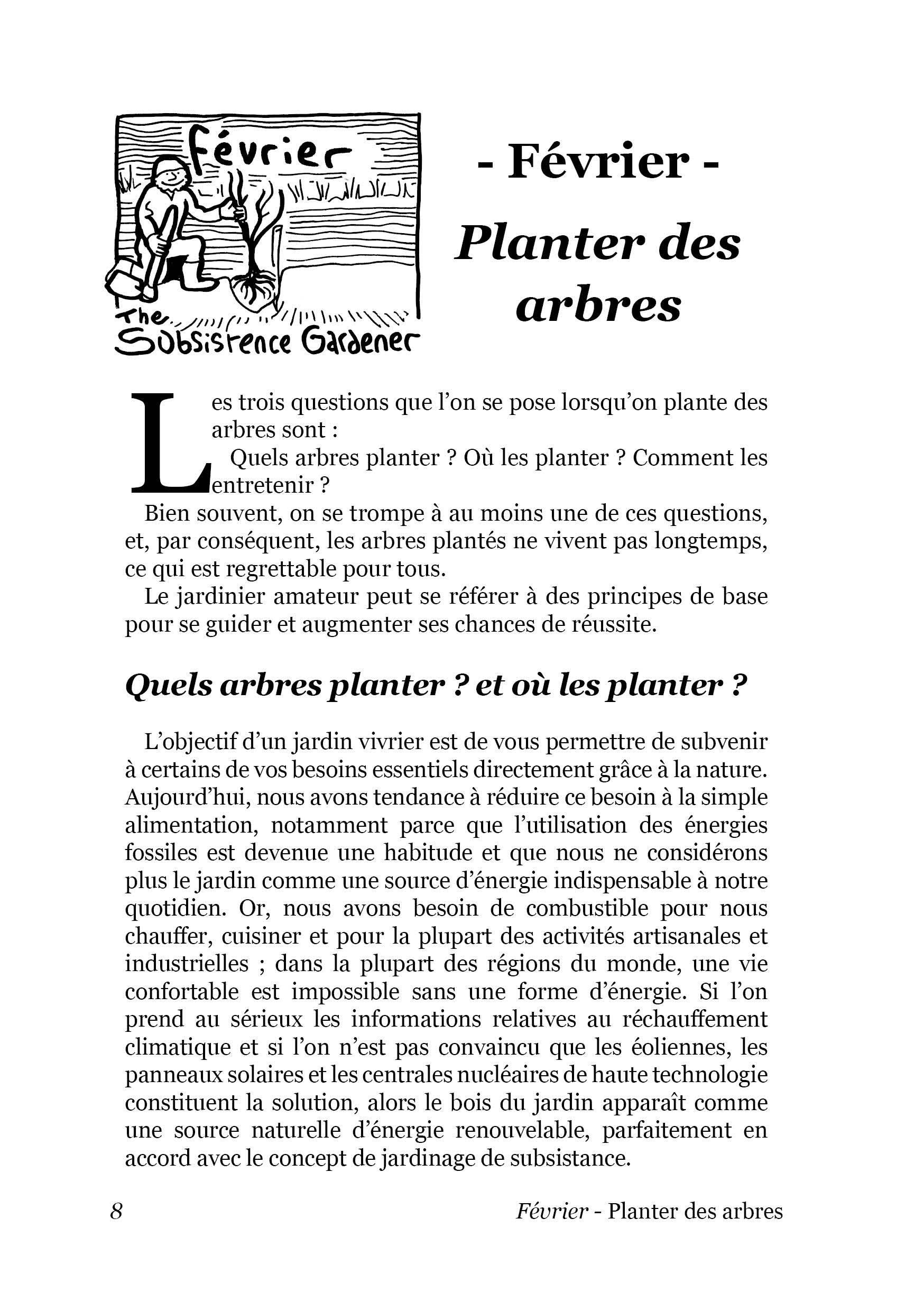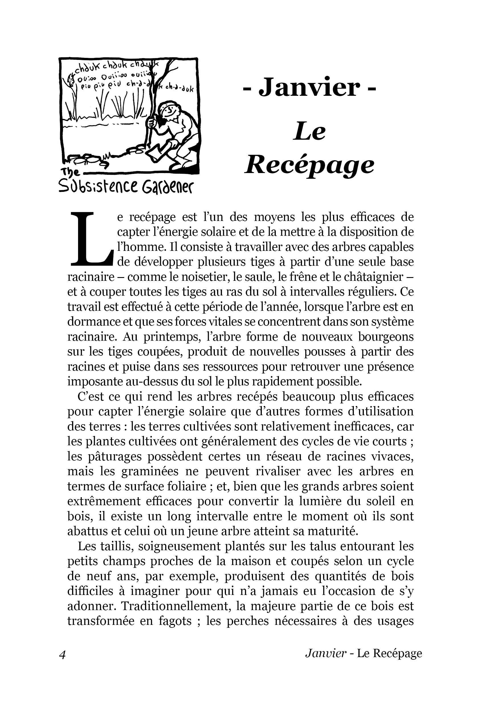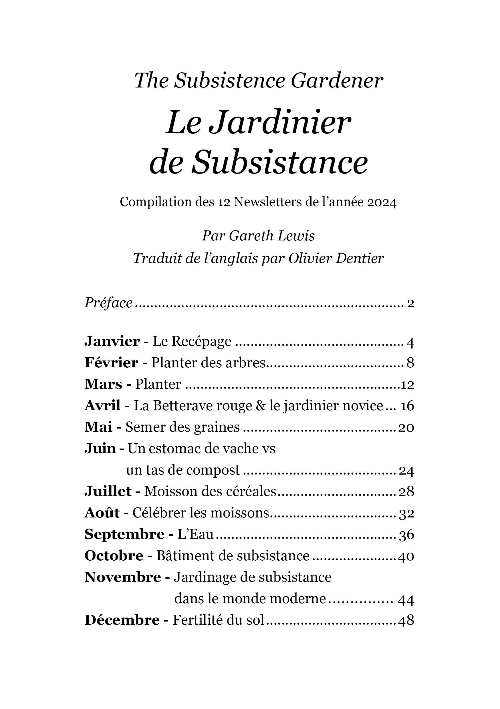 Janvier – Le Recépage / Février – Planter des arbres / Mars – Planter / Avril – La Betterave rouge & le jardinier novice / Mai – Semer des graines / Juin – Un estomac de vache vs un tas de compost / Juillet – Moisson des céréales / Août – Célébrer les moissons / Septembre – L’Eau / Octobre – Bâtiment de subsistance / Novembre – Jardinage de subsistance dans le monde moderne / Décembre – Fertilité du sol