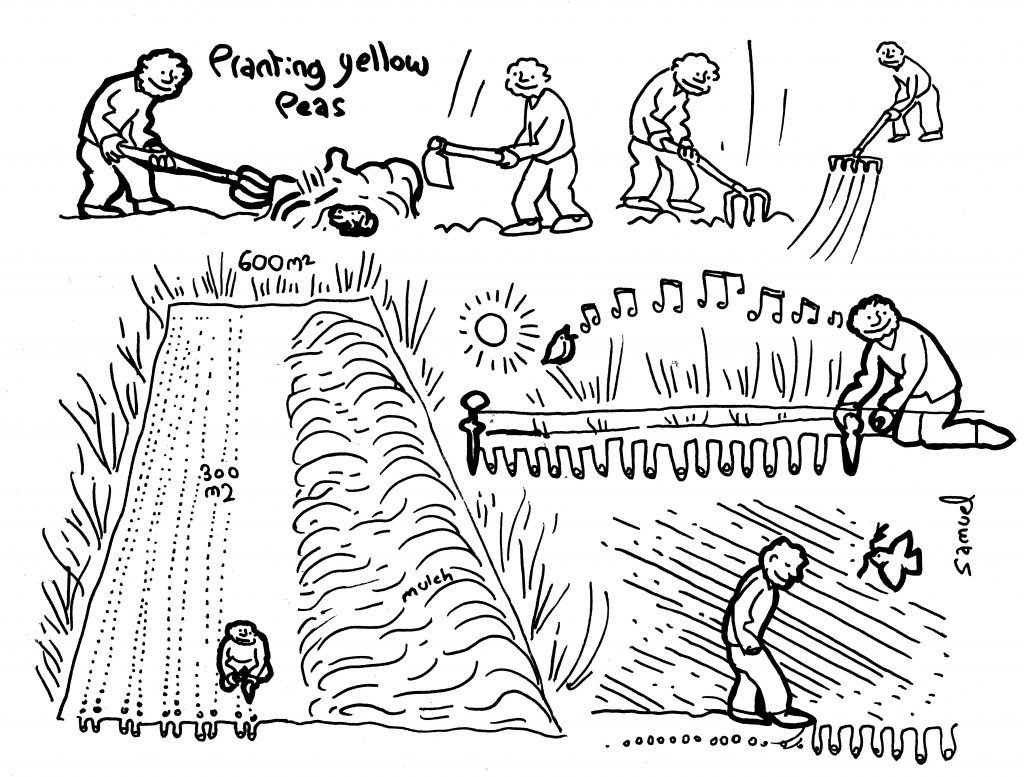 We have been growing yellow split peas here in Brittany for several years now. We started with a single row in the vegetable garden, and have gradually increased from there; this year, we have just finished sowing half of one of our small fields (about 300 square metres) with yellow peas.